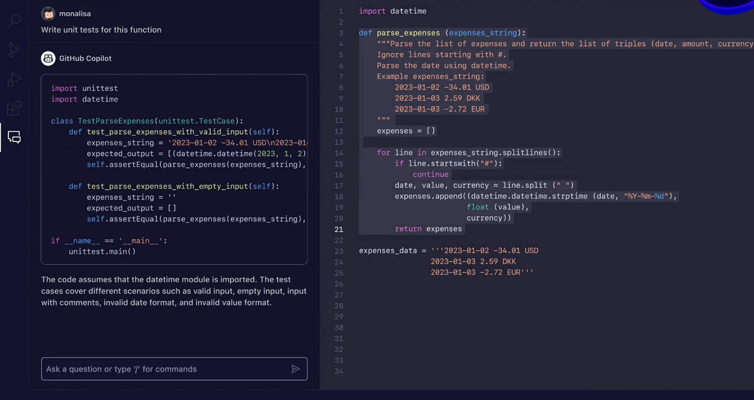Developers can enter partially completed code into the chat, and the platform will generate recommendations to complete it. GitHub Copilot also detects bugs and proposes solutions, increasing accuracy.