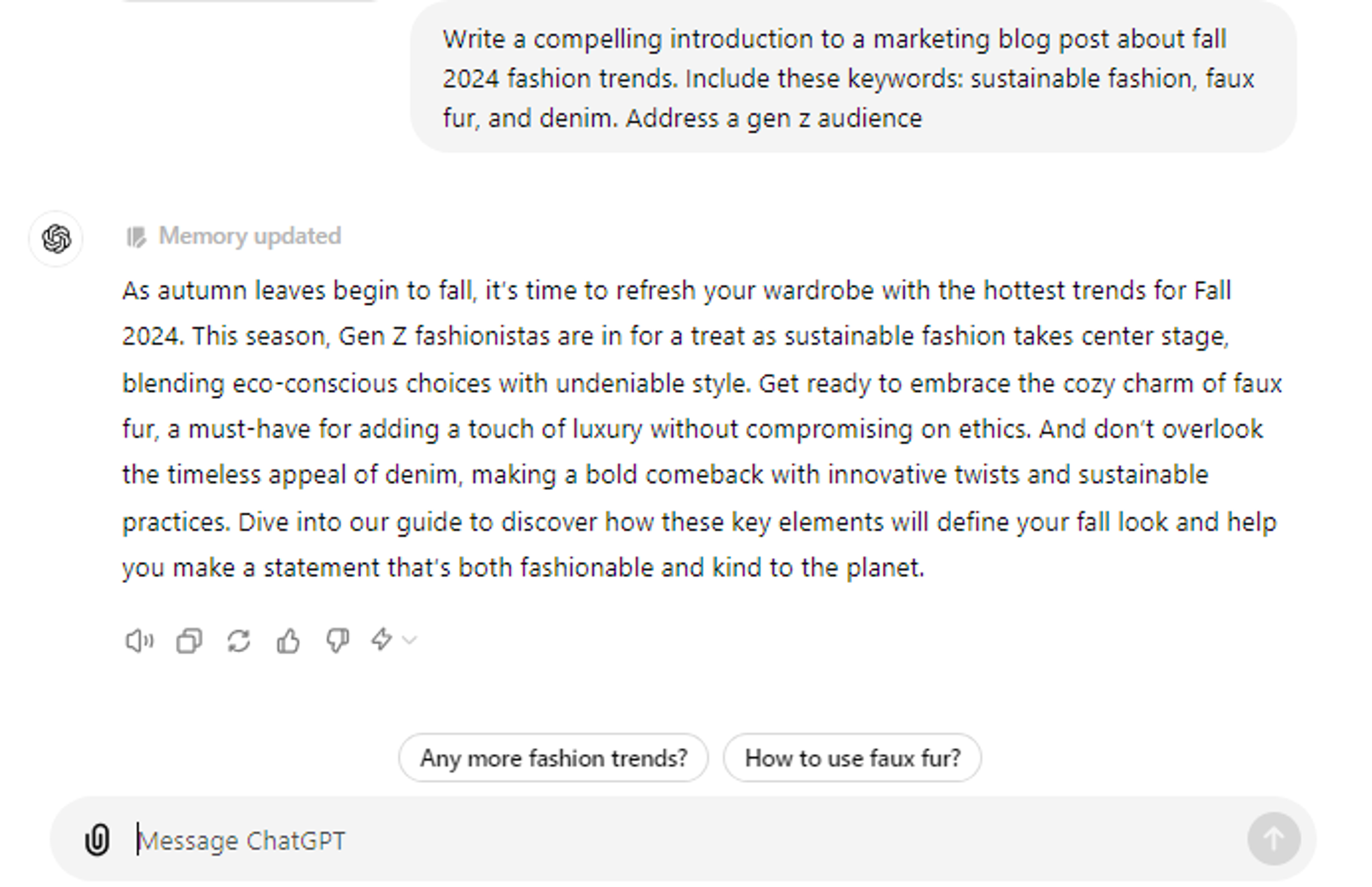 A marketer could prompt the AI tool to generate a blog post about fashion trends and include specific keywords to boost its visibility in search engine rankings. The app performs these tasks in seconds, while a human might take hours to complete the same process manually.