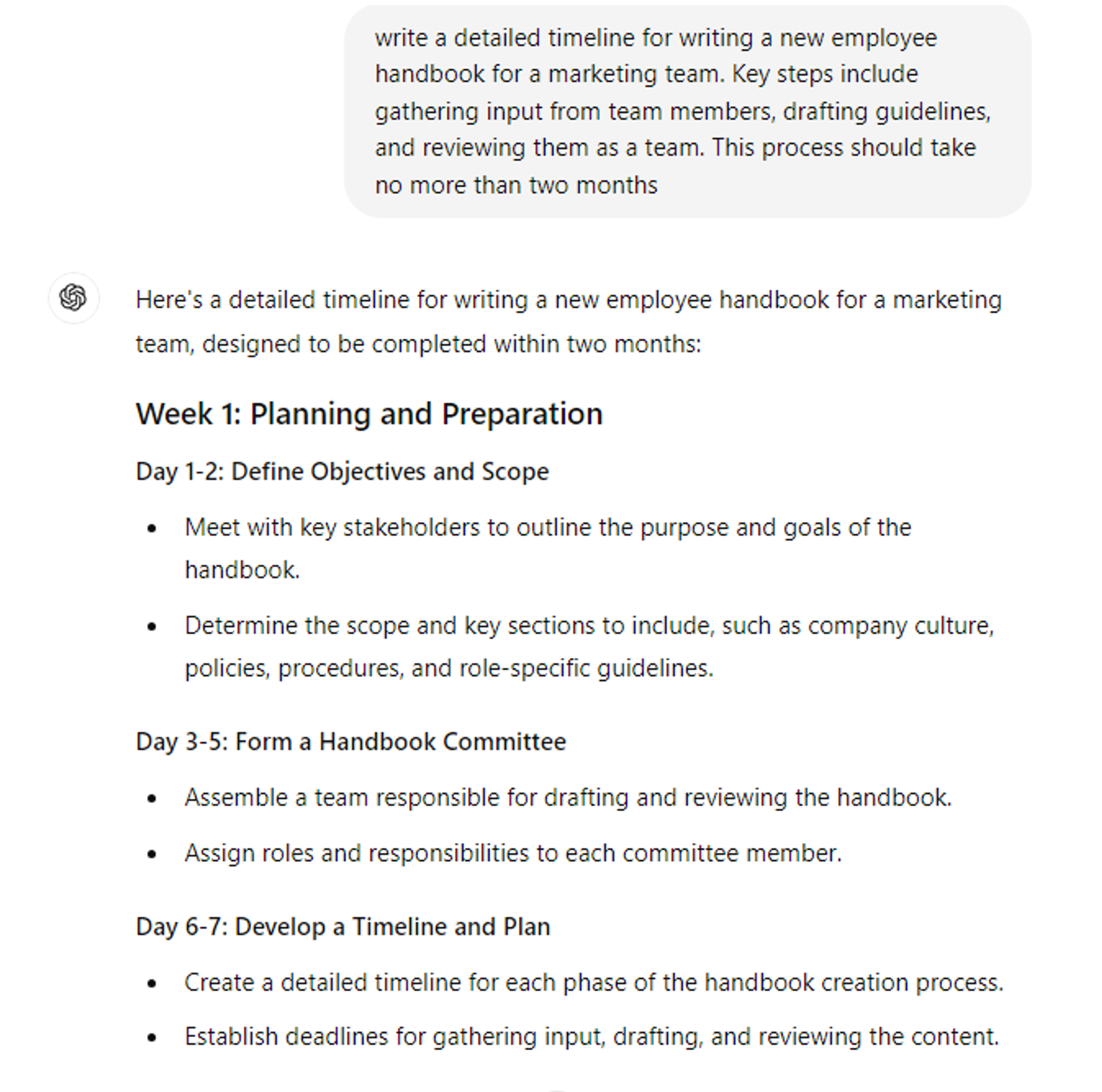 ChatGPT can generate detailed timelines for developing an employee handbook and other projects.