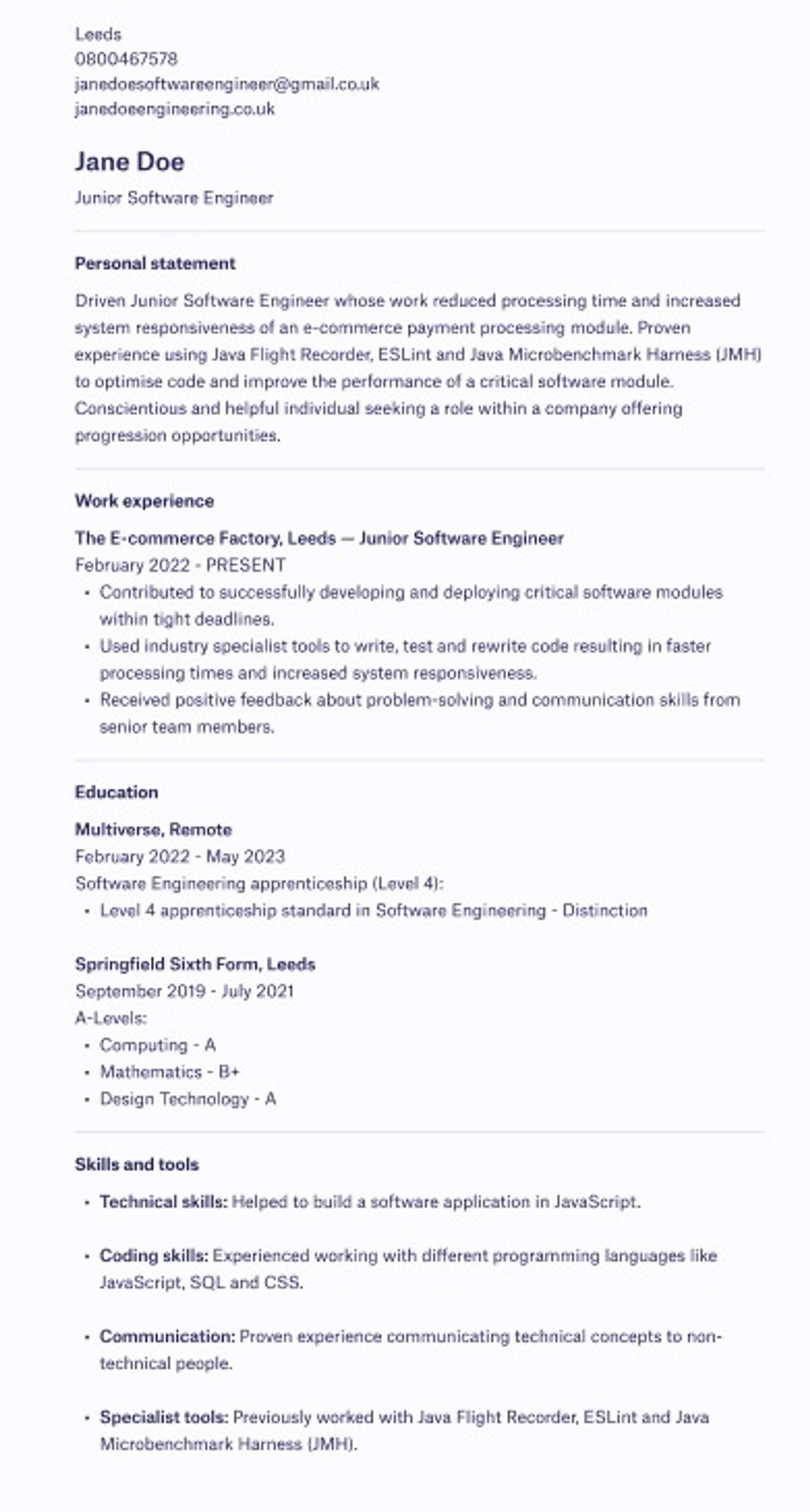 You don’t need a CV to start a Software Engineering apprenticeship with Multiverse. But having one to hand is helpful as you advance through your career.