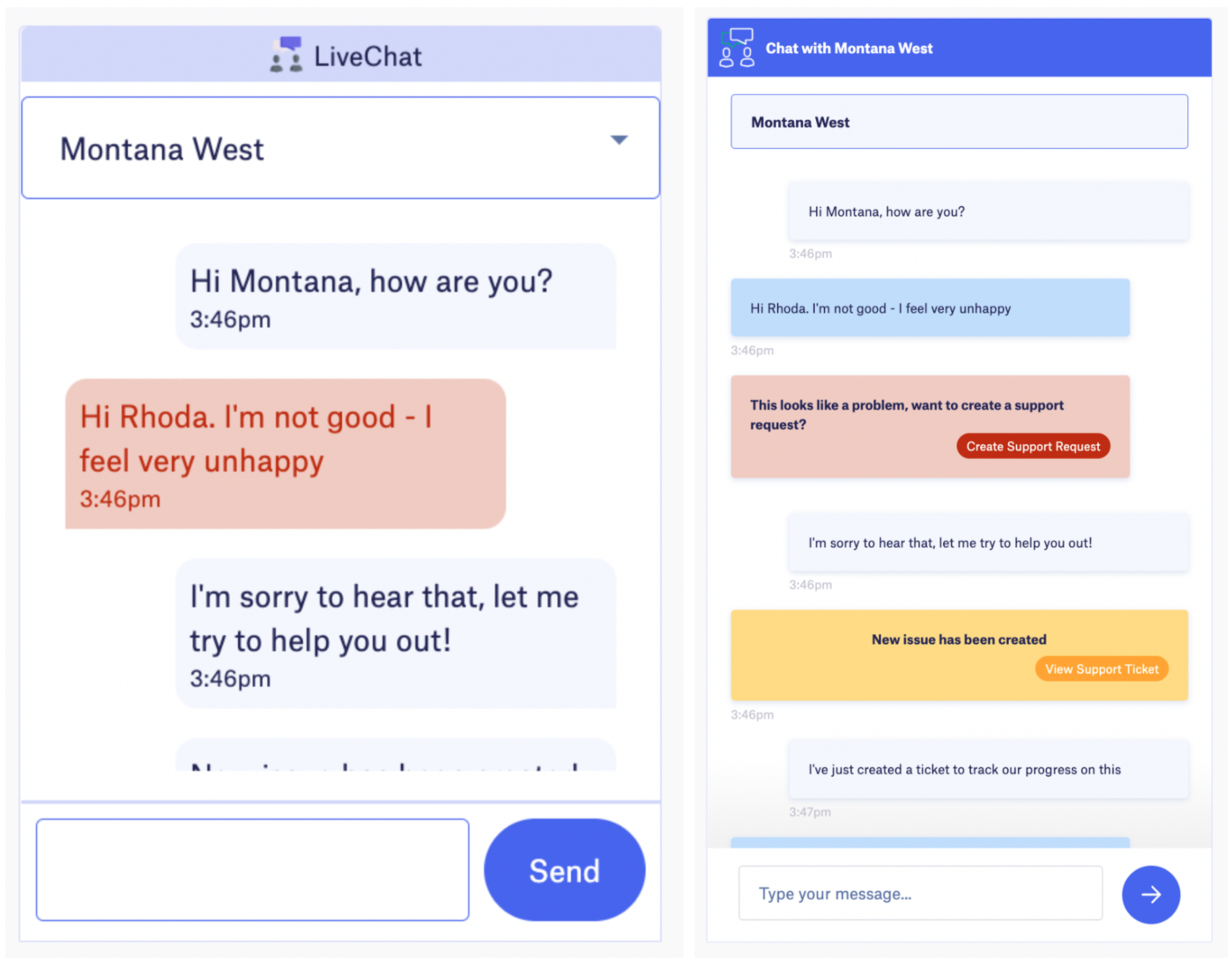 On day two we regrouped to link the live chat with the issue tracker. Tying everything together was mostly smooth, apart from a few gnarly merge conflicts we had to resolve last minute — there’s no hackathon without it. For messages with negative sentiment, we’d generate a link to create a new support request, and pre-fill some required information in the issues form. In this case, a picture says more than a thousand words. See a screenshot of the final result below: