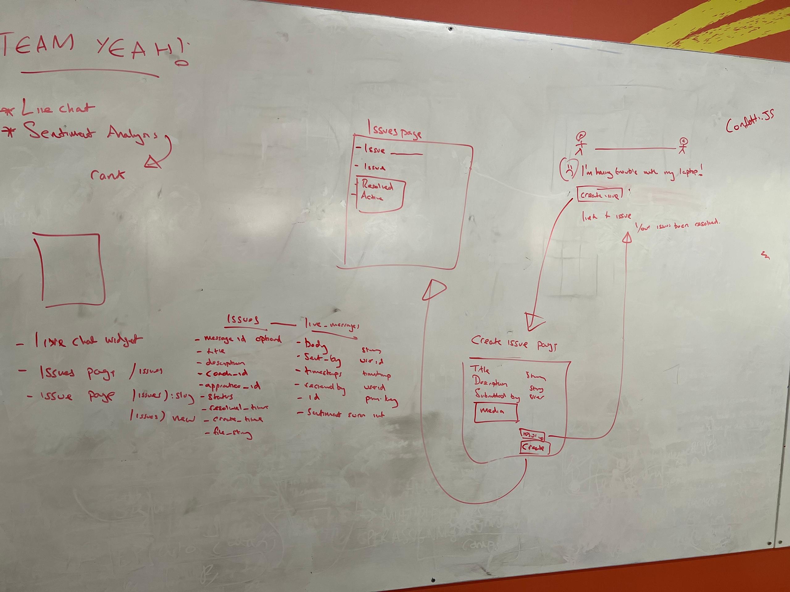 We then decided to divide and conquer. Chris and I would work on the live chat functionality, whereas Tom, Austin and Anne-Laure would work on the issues page — later on we would link the two together. Our product manager Naomi was there to make sure we kept focussing on solving real problems for apprentices and coaches, and to build a solid presentation for Demo Day — so we’d maximise our chances of impressing the judges and winning a prize. Importantly, we also decided on a team name: Team Yeah! (because.. yeah)