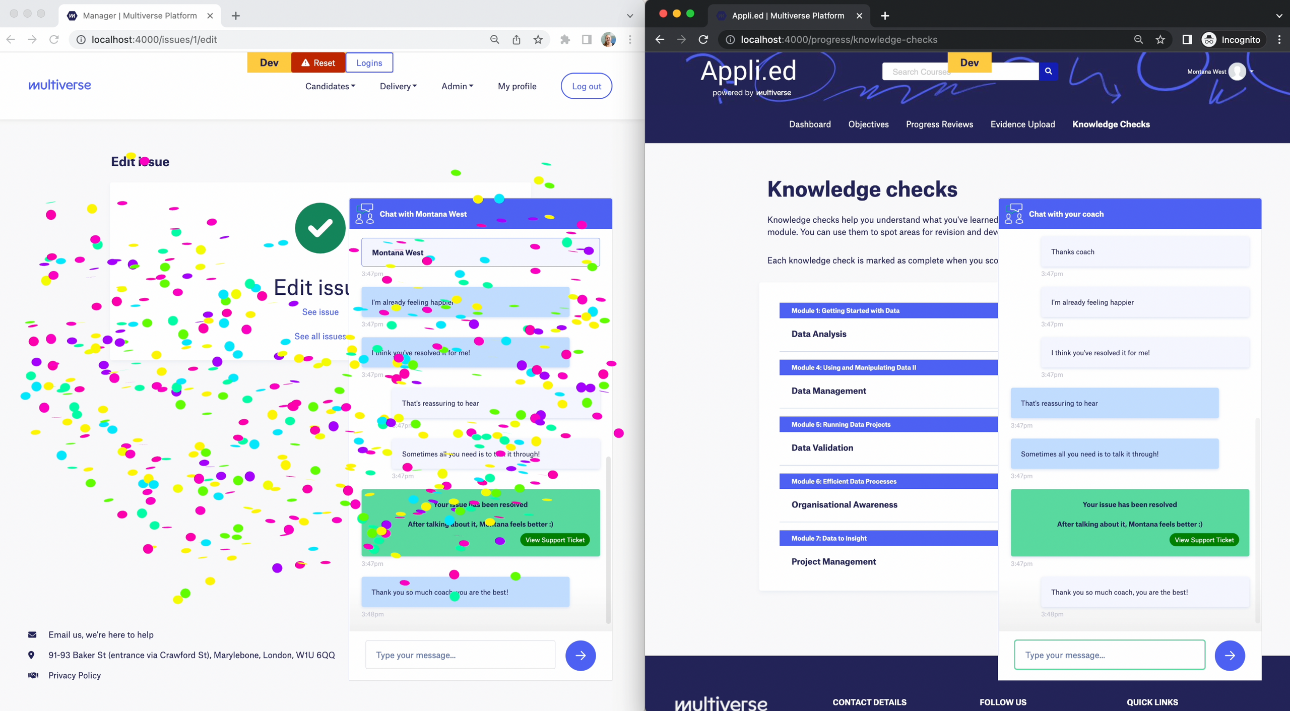 To make things extra fun, we decided to do sentiment analysis on messages sent between coaches and apprentices. If the message got a low sentiment score, for instance when an apprentice expressed they were having problems and needed support, we would produce an additional message prompting the coach to create a support request. If the sentiment of the message was very positive, we would celebrate with some confetti.