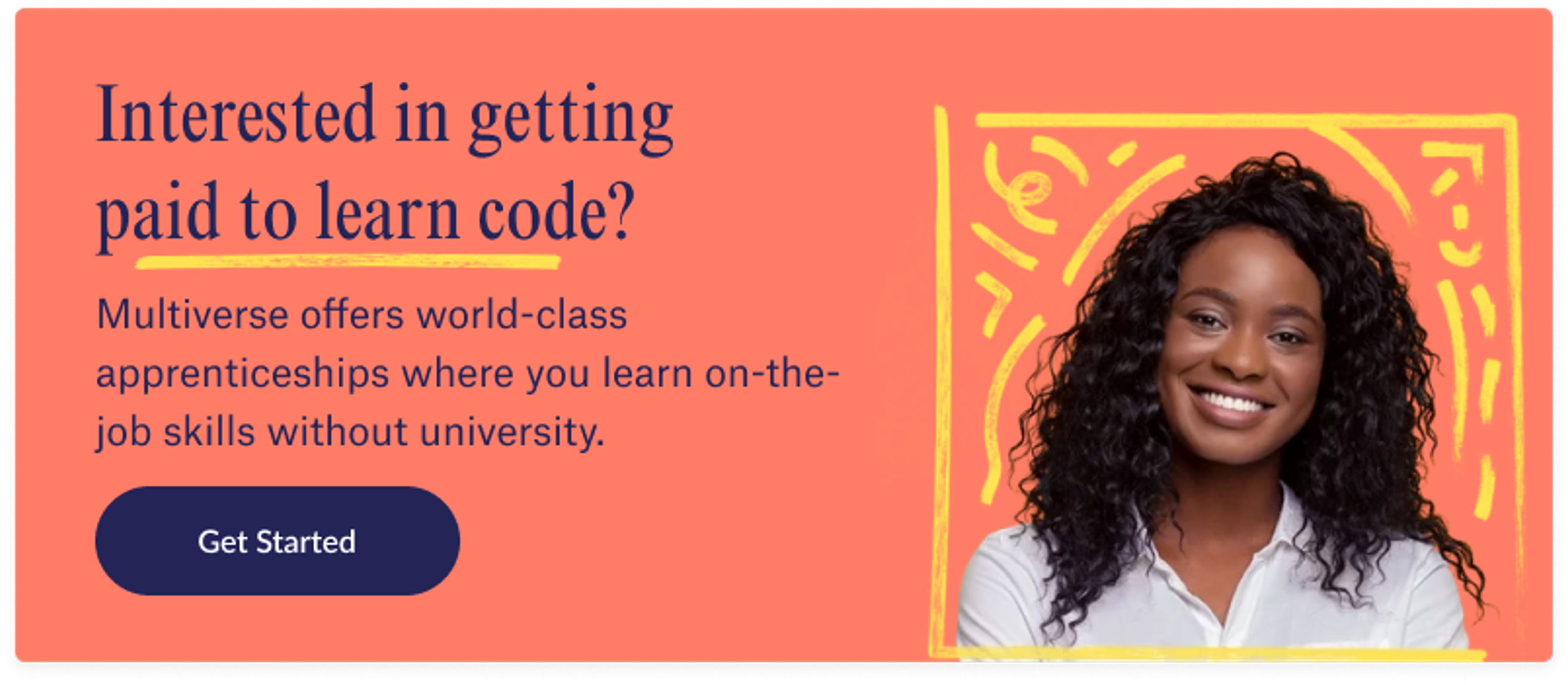 You don’t need to spend money on expensive bootcamps or college degrees to learn Java and JavaScript. A Multiverse apprenticeship allows you to get paid to learn code and build your portfolio. You can study the programming languages that align with your career goals. We also support your professional development with mock interviews, personal coaching, and more.