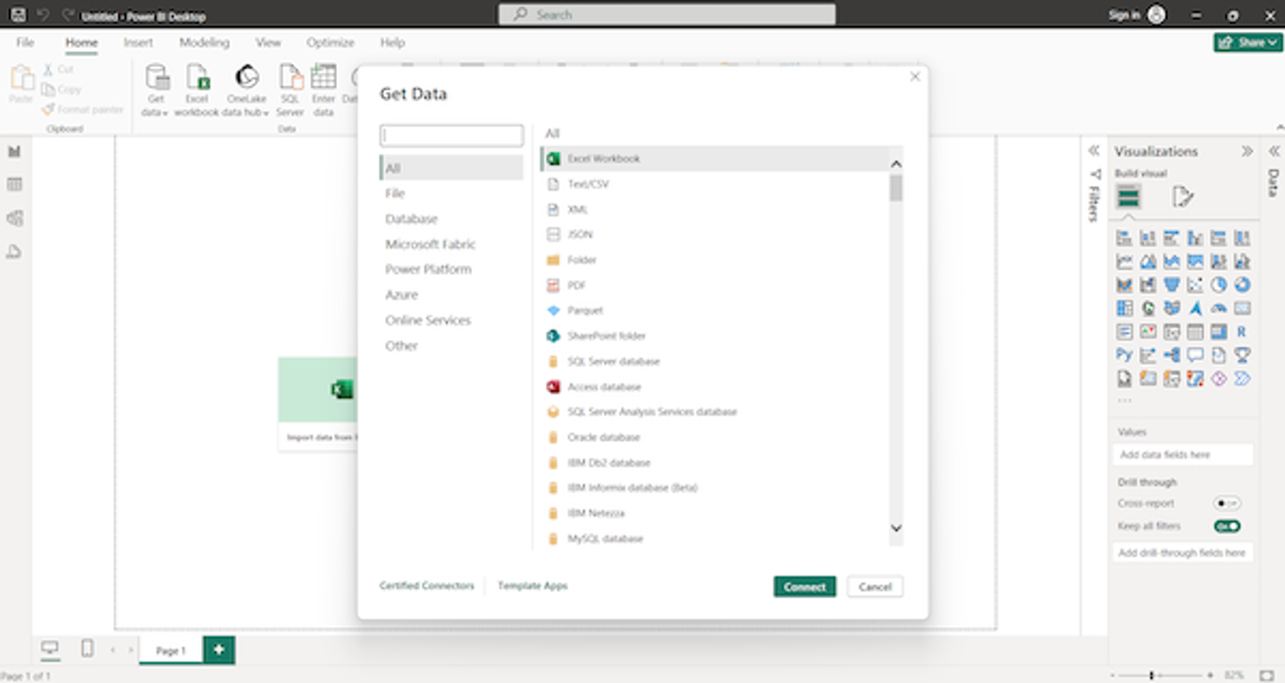 Microsoft Power BI Desktop users typically import data from external sources, such as cloud platforms and Excel files. Click “Get data from another source” to view all your options. For instance, you can connect data from an Access or MySQL database.