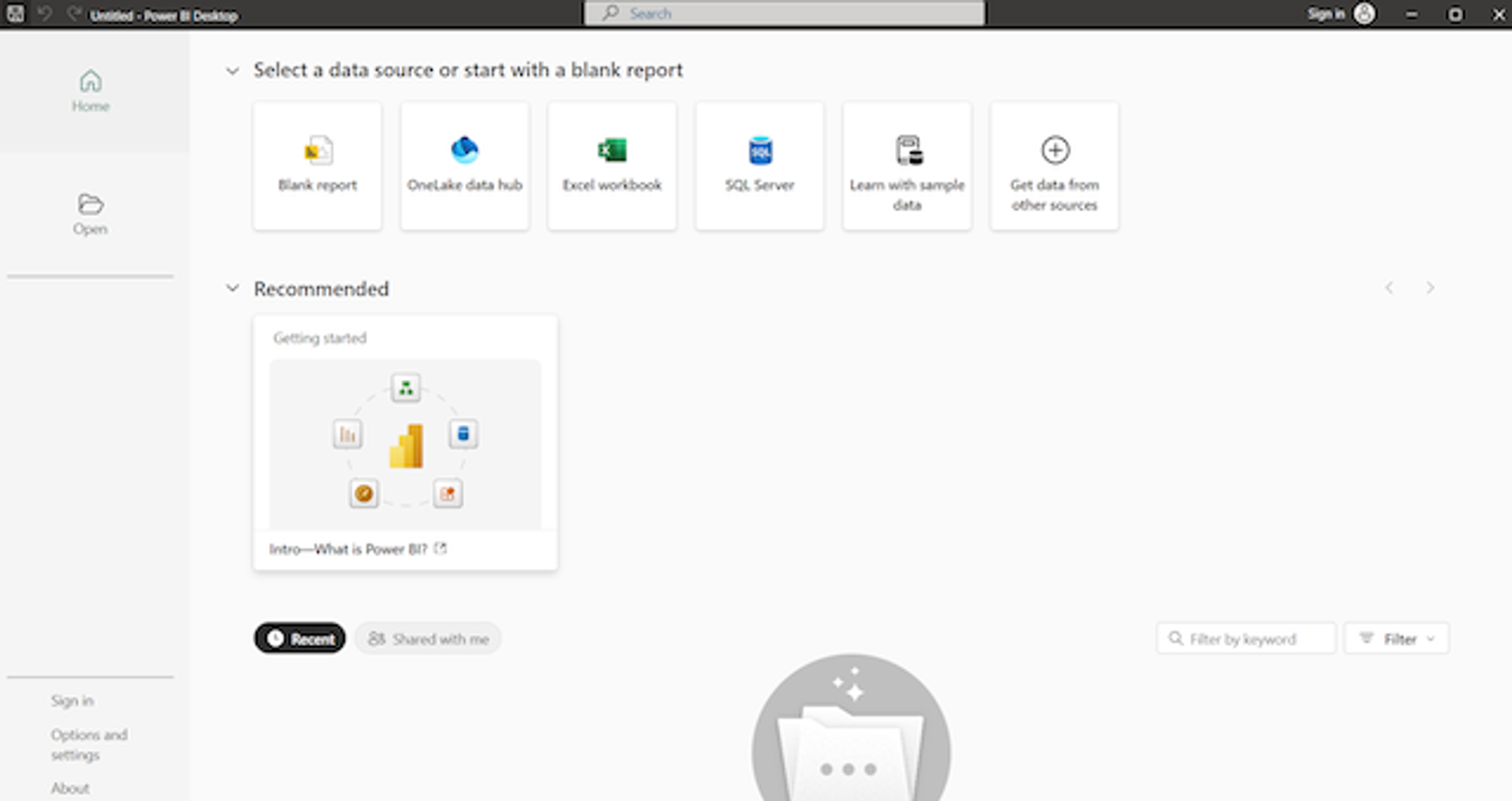 First, visit the Microsoft store or website to download Power BI Desktop(opens new window). Once the application is installed, launch it and arrive at the home page. You may want to click “Intro–What is Power BI?” to complete a 21-minute tutorial on the Microsoft website. You can also sign up for a Power BI account to access more features.