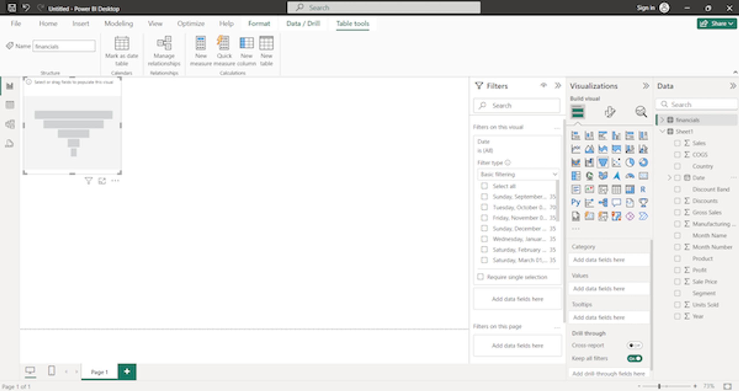 Next, select the type of visualisation you want to create and use the drag and drop interface to add fields from your data. For instance, you can create bar charts or line graphs to visualise sales trends. You can also insert buttons, explanatory text boxes, and other elements.