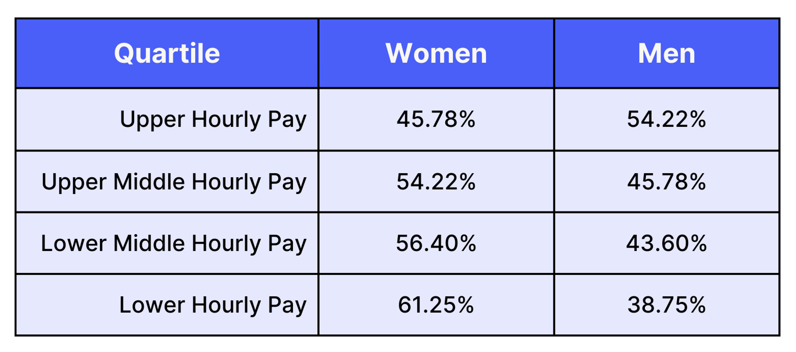To understand this data better, we can look at how women’s and men’s pay was distributed. To calculate this, we have split all of our team members into pay quartiles and worked out the proportion of men and women in each quartile. Overall, we have more men in our highest paid roles and more women in our lowest paid roles.