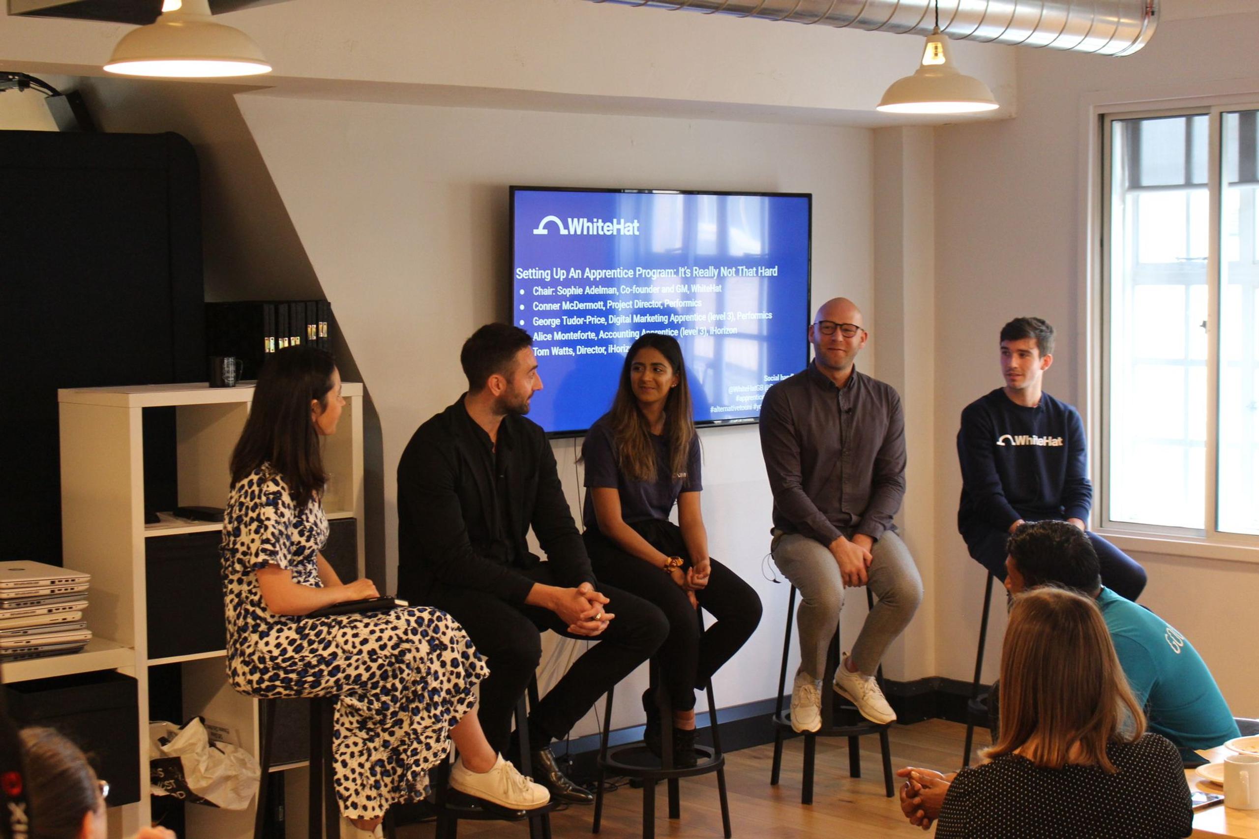 Sophie Adelman, co-founder of WhiteHat, chaired the panel and was joined by Conner McDermott, Project Director & George Tudor-Price, Digital Marketing Apprentice from Publicis and Tom Watts, Director & Keyuri Dattani, Accounting Apprentice from iHorizon.