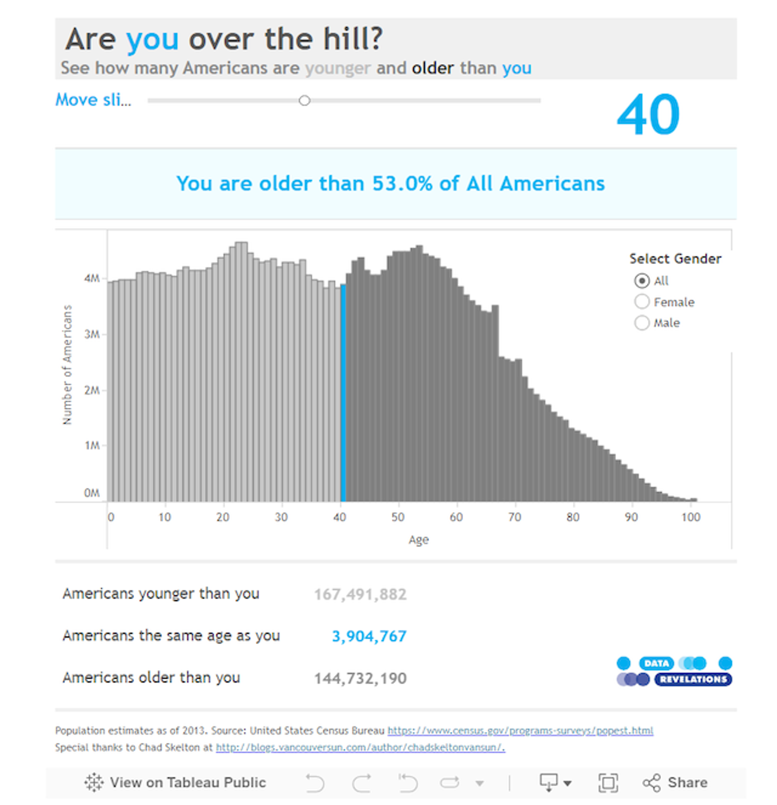 For example, Steven Wexler used data from the United States Census Bureau to create a Tableau dashboard titled “Are you over the hill?” Users can adjust a slider to select their age and view how many Americans are younger and older than them. They can also filter the chart by gender for more tailored insights into the country’s age distribution. This playful dashboard personalised demographic trends by making it relevant to the audience’s life stages.