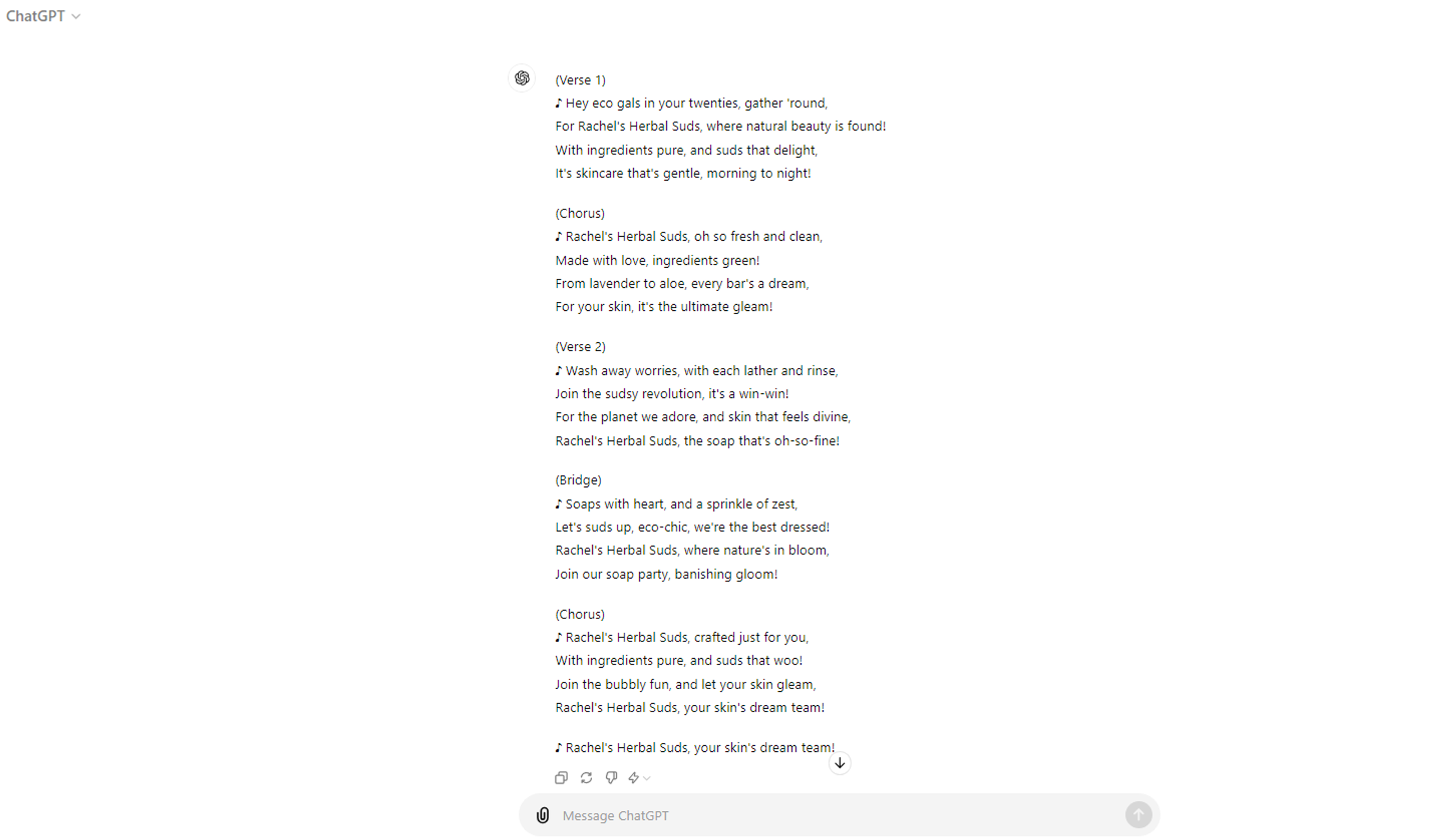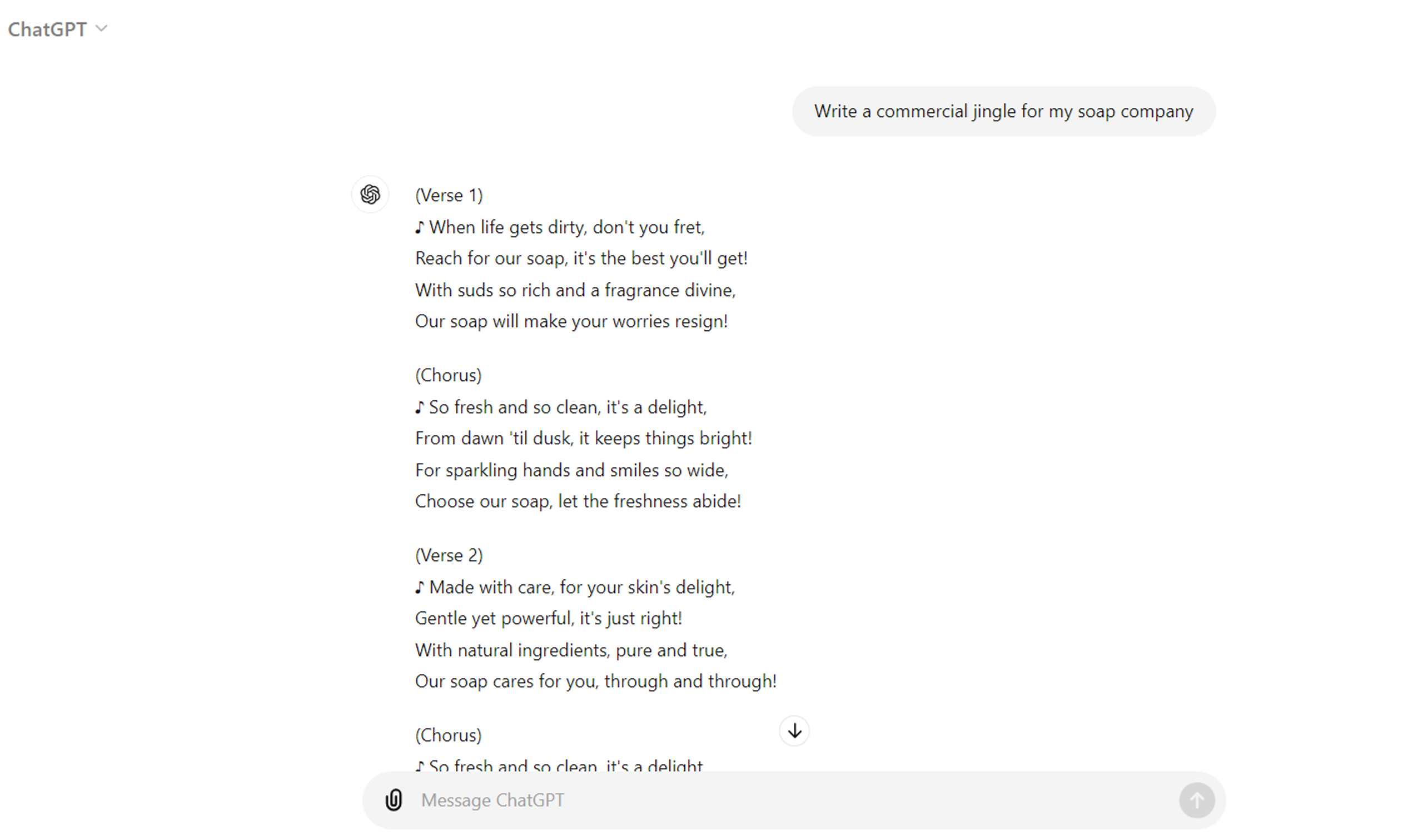 Suppose you want to use ChatGPT to write a jingle for your organic soap business. Here’s the output ChatGPT generates if you input this generic prompt: “Write a commercial jingle for my soap company.”